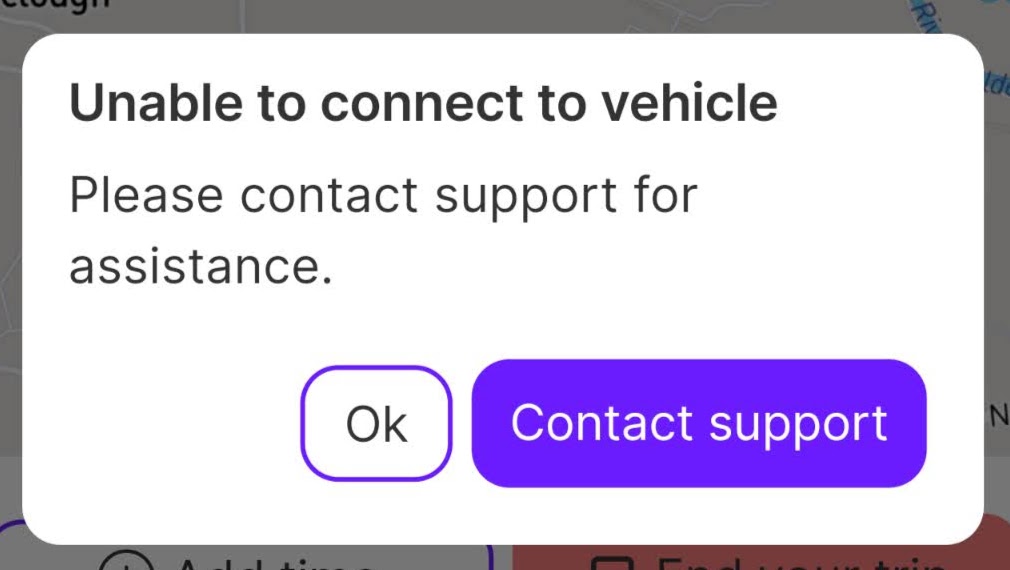 | We do just need to let you know about one quirk which we will iron out as soon as we possibly can. With the new car, when you lock it at the end of your hire, it will lock, but the app will wrongly say it has failed to connect, and offer buttons “OK” or “Contact support”. Before you contact support, please try this: |